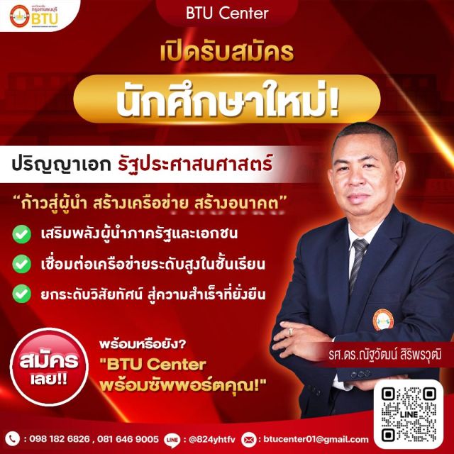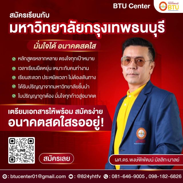 มหาวิทยาลัยกรุงเทพธนบุรี - BTU มีอาจารย์ฝ่ายแนะแนวการศึกษาพร้อมให้บริการข้อมูลการสมัครเรียน รายละเอียดหลักสูตร ค่าเทอม กองทุนกู้ยืม กยศ. - กรอ. ผ่านระบบแชทโซเชียลมีเดียและทางโทรศัพท์ได้ทันที