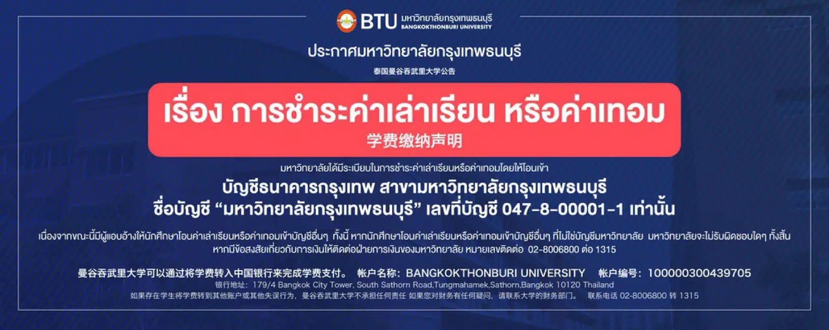 ชำระเงินค่าสมัครเรียนและลงทะเบียนเรียนผ่าน Internet Banking บัญชีชื่อ มหาวิทยาลัยกรุงเทพธนบุรี เท่านั้น
